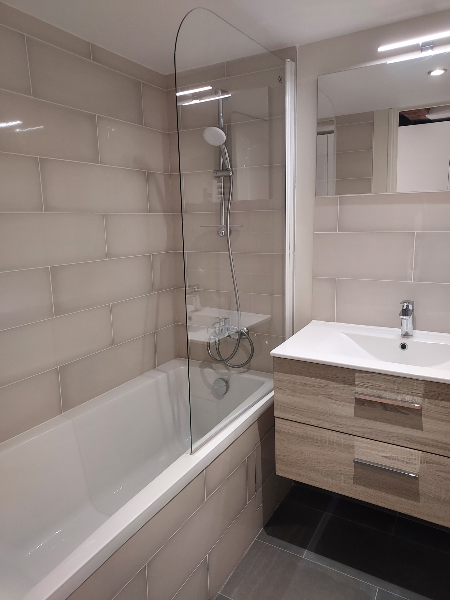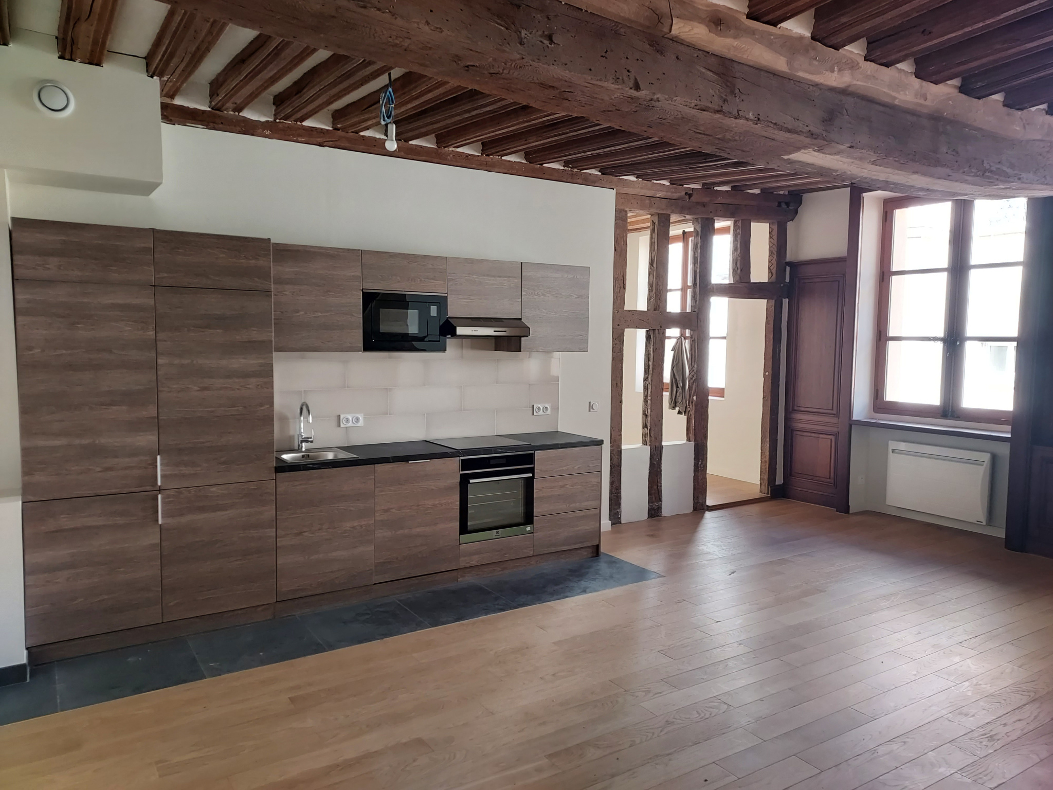 Ancien hotel Séguier, APPARTEMENT NEUF en duplex comprenant: entrée en colombages, séjour avec cheminée et cuisine aménagée et équipée, belle hauteur sous plafond, chambre, salle de bains, wc avec lave linges. En duplex: grande chambre. Surface au sol 91.08 m2.